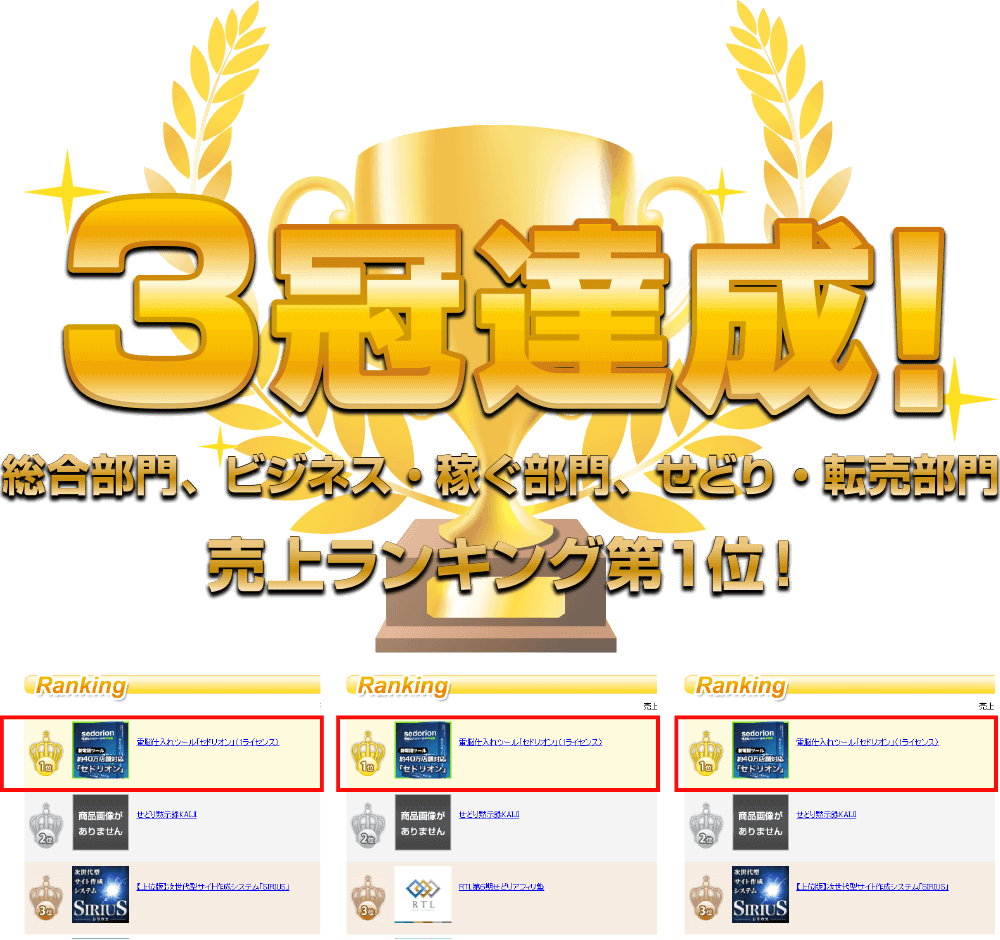 販売サイトの売上ランキング3冠を達成し、川島和正さん著【手堅く1億円を稼ぐ7つの最新手法。お金儲け2.0】でもおすすめツールとして掲載されるほど、大きな評価をもらっているぞ。